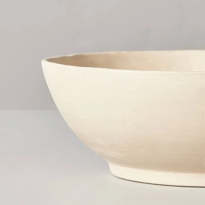 Decorate your entryway or living room table with this Artisan Handcrafted Decorative Round Bowl Cream from Hearth & Hand™ with Magnolia. This handcrafted paper bowl in a round shape is designed with raised sides in a cream finish for easy blending with any decor. The multipurpose bowl can be displayed alone as a decorative piece or can be used storing keys and other small items. Plus, it can be spot cleaned when required.
