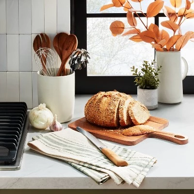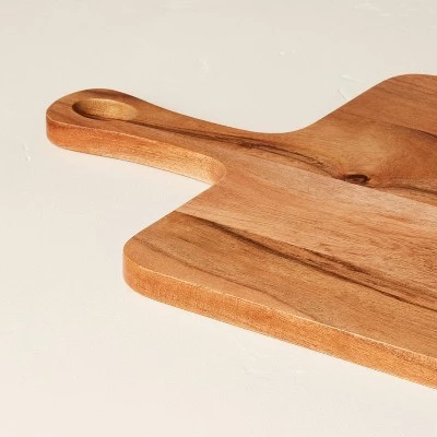 Give your kitchenware a super-versatile update with this 11-Inch x 16-Inch Wood Cutting & Serve Board from Hearth & Handâ„¢ with Magnolia. Made from acacia wood for an elegant look, this cutting board doubles as a serving board you can use for appetizers, cheese platters, bread loaves and much more. The handle makes it easier to carry and features a loop for space-saving hanging storage, and the board can be spot cleaned or wiped clean after use to keep it looking its best for longer.