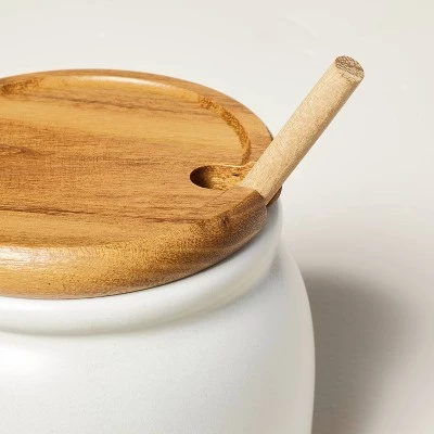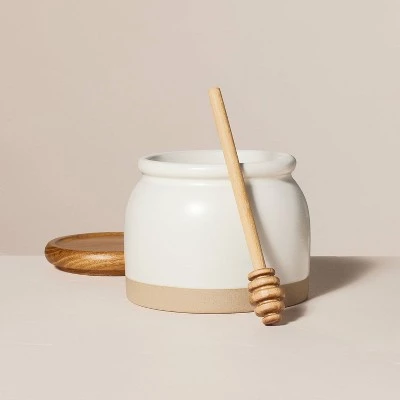 Make your meal routine more convenient by storing and serving honey in the 16-Ounce Stoneware Honey Pot with Wood Dipper and Lid in Cream/Clay from Hearth & Hand™ with Magnolia. This cream honey pot features a neutral-shade bottom for a two-tone look, and comes with a wooden lid and dipper for coverage and easy pouring of the honey. Made with stoneware, this two-tone honey pot makes a perfect addition to your kitchen.
