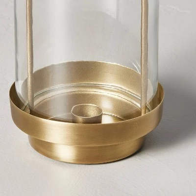 Light up your space in style with this Glass & Brass 1-Count Taper Candle Sconce from Hearth & Handâ„¢ with Magnolia. This candleholder features a cylindrical glass shape detailed with an antique brass base, rim and handle detail for a unique, chic look that goes with any decor. Compatible with one taper candle, this decorative and functional piece can be placed on your mantel, entryway console or dining table for endless display and lighting options.