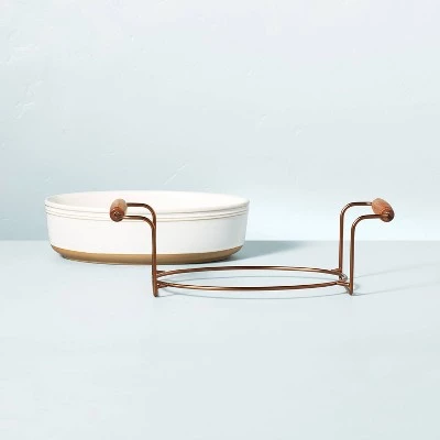 This Oven-to-Table Stoneware Oval Baking Dish with Cradle Carrier from Hearth & Hand™ with Magnolia makes entertaining friends and family hassle-free. Bake your favorite casserole in this oven-safe oval dish and then simply place it in the cradle carrier to display and serve. The wooden handles make for easy carrying from oven to table. The beautiful two-tone baking dish is crafted from stoneware for a decorative and functional essential you’ll want to keep in your kitchen for years to come.
