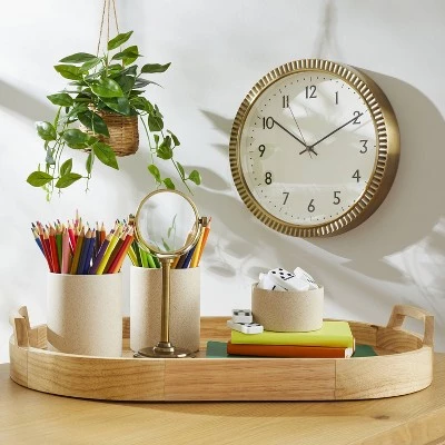 Elevate the display of any table with this Decorative Oval Wood Tray from Hearth & Handâ„¢ with Magnolia. This wood tray features an oval shape detailed with raised sides, and side handles in a natural hue for easy blending with any decor. The multipurpose tray can be displayed alone as a decorative piece or can be used storing items like notebooks, pen holders and more.
