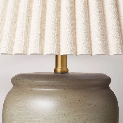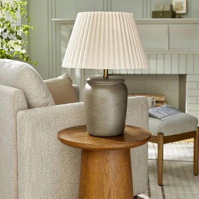 Bring decorative appeal to your indoor lighting with this Pleated Shade Ceramic Table Lamp from Hearth & Hand™ with Magnolia. This beautiful table lamp features a gray ceramic base and comes with a pleated empire shade for a graceful, textured look. The one-way light setting with a rotary socket switch allows for easy operation. Place it on any side table next to your sofa in your living room, or on a nightstand in the bedroom for warm lighting.