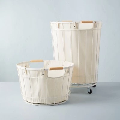 Make laundry day less stressful with this Wire & Fabric Laundry Hamper from Hearth & Handβ’ with Magnolia. Designed in a round silhouette with a wired metal frame, this laundry hamper features a soft inner fabric liner to keep your laundry hidden from view. The open-top design comes in handy for sorting through laundry, while the two side wooden handles make it easy to carry. Featuring a white metal frame with a cream fabric liner and natural wooden handles, this laundry basket brings a dash of style to your laundry room.