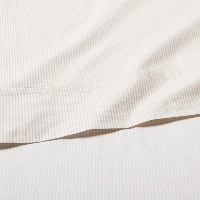 Bring year-round comfort to your bedding with this Cotton Percale Microstripe Sheet Set from Hearth & Hand™ with Magnolia. This percale bed sheet set includes a matching pillowcase, flat sheet and fitted sheet for a coordinated look. Each of the pieces features allover microstripes on a cream backdrop to bring chic appeal to your bedroom decor. The soft and breathable cotton fabric offers a comfortable night’s sleep, and it can be machine washed for easy care. Pair with your choice of comforter or quilt and some throw pillows for a warm and inviting bedroom setting.
