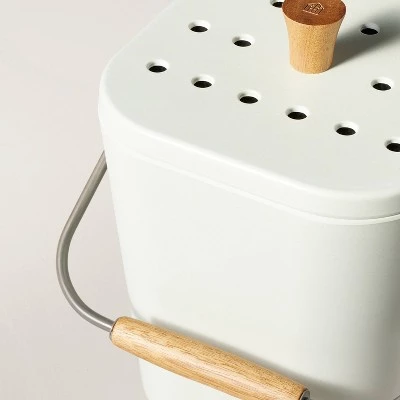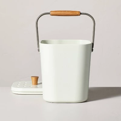 Conveniently collect kitchen scraps for composting in this Countertop Melamine Compost Bin from Hearth & Hand™ with Magnolia. Made from melamine, this compost bin features a light green finish that looks great placed on your kitchen countertop. It’s features a removable lid featuring a vented design to prevent odors while allowing airflow. A swinging metal handle with a wooden grip allows for convenient portability, while the wooden knob on the lid makes it easy to open and close.