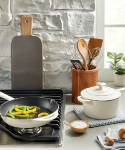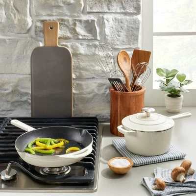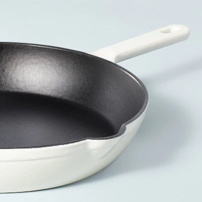 From thick-cut steak to pan pizza to sauteing vegetables or frying eggs, bring perfection to your cooking with this Enameled Cast Iron Skillet from Hearth & Hand™ with Magnolia. Made from cast iron that helps retain heat to offer you an even heating area, this skillet is compatible with electric and gas stoves, and it’s oven-safe up to 500 degrees to let you cook a variety of dishes. Designed with a five-inch handle, this cast iron skillet features an enameled surface for easy maintenance, making it an essential component of every kitchen.