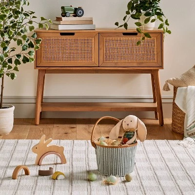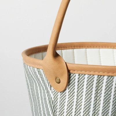 Welcome Easter in sweet style with this Fabric Easter Basket with Faux Leather Handle from Hearth & Handâ„¢ with Magnolia. Designed in a bucket shape, this decorative basket features an open-top design for easily stashing or picking items from the inside. Featuring a green woven design with white horizontal stripes, it brings cute style to your Easter decor, while a single tote handle makes it easy to carry.