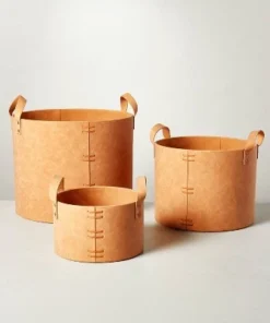 Flaunt your elegant style by organizing any space with the Faux-Leather Storage Bin from Hearth & Hand™ with Magnolia. Made from faux leather, this camel brown storage bin works well in your living room, home office or any other area. The round shape with an open top makes it easy to place and remove the contents, and it comes with built-in handles for easy lifting and moving around your home — plus, it even boasts a stackable design for added convenience. Simply add similar storage boxes of varying sizes to combine organization and coordinated style.