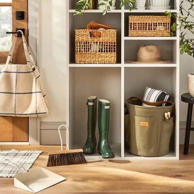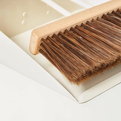 Tackle small messes with the help of this Hand Broom and Dust Pan Set from Hearth & Handâ„¢ with Magnolia. This set includes a metal dust pan and a hand broom designed for quick cleanups. Featuring an angled design, the dustpan easily catches dirt or debris with the help of the thick bristles in the hand broom. Compact in size for easy operation and portability, they feature a non-abrasive design to help prevent your floors or surfaces from marks or damage. Best of all, a hanging loop helps easily hang them from a hook or nail for convenient storage.