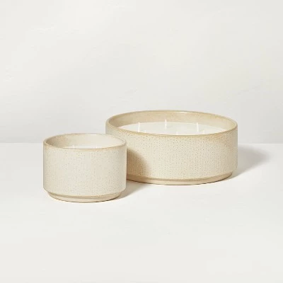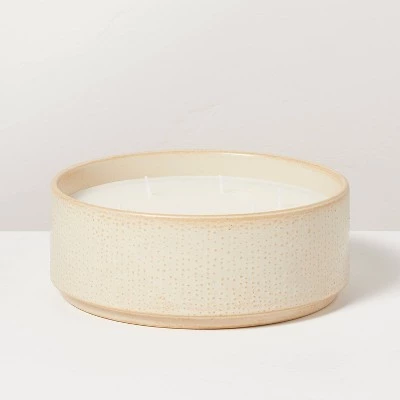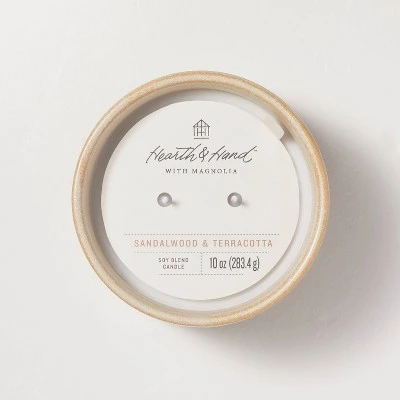Relax with the woody, earthy fragrance of the Hobnail Ceramic Sandalwood & Terracotta Jar Candle from Hearth & Hand™ with Magnolia. This beige ceramic jar candle is designed in a round shape with a speckled textured pattern for extra visual appeal. Made with soy and paraffin wax, this candle features the scents of sandalwood.