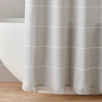 Bring a touch of elegant style to your bathroom decor with this Horizontal Stripe Shower Curtain with Fringes from Hearth & Handâ„¢ with Magnolia. Boasting a soft, cotton-blend dobby construction, this decorative shower curtain features horizontal stripes in cream on a gray background for classic styling, and it’s accented by a fringed hem that adds eye-catching flair. Featuring a buttonhole top for easy installation, you can toss it in the washing machine for a quick refresh when needed.