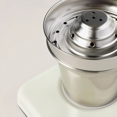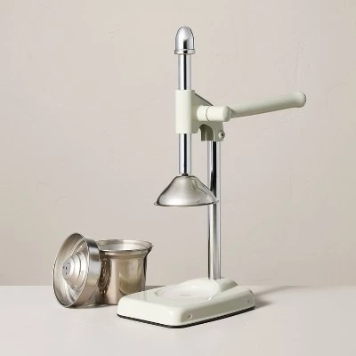 This Manual Hand Press Juicer from Hearth & Hand™ with Magnolia simplifies the chore of slicing and extracting to make delicious fresh juices at home. The manual hand press juicer has a body made of stainless steel, aluminum alloy and plastic with a chrome and light green finish, and it includes a long handle for easy use.
