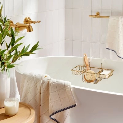 Keep bath essentials ready at hand with the Over-the-Side Wired Bathtub Caddy from Hearth & Hand™ with Magnolia. This brass-finish bathtub caddy is made with metal in a wired design for a stylish look that suits your bathroom setting well. Easy to hang, this metal bathtub caddy makes a functional addition to your bath space.