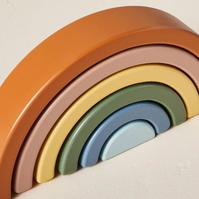 Keep your young one engaged in imaginative play with this 6-Piece Toy Rainbow Wooden Block Stacker from Hearth & Hand™ with Magnolia. Carved out of wood, these stacker blocks feature U-shaped designs in the colors of the rainbow to add a bit of magic to their playtime. Great for keeping them entertained, the wooden block stacker can also be arranged to add to your home decor.