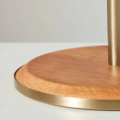 Add functional style to your kitchen, bathroom or vanity with this Wood & Brass Paper Towel Holder from Hearth & Hand™ with Magnolia. Set on a round wooden base, this paper towel holder features a metal center spire for easily setting and tearing the paper towel. Showcasing a wooden metal finish with a brass spire, it’s sure to add classic style to your space.