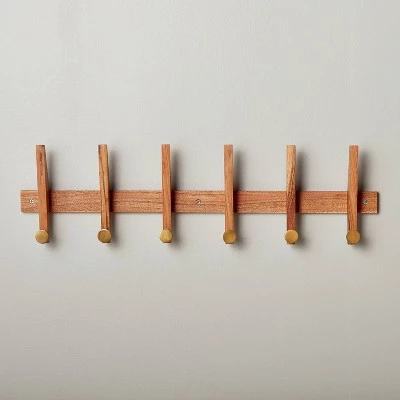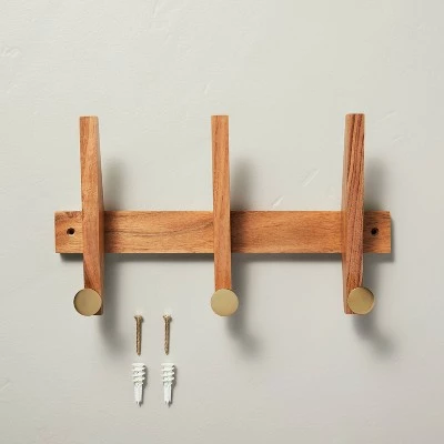 Keep your everyday accessories neatly organized with this Wood & Brass Hook Rail from Hearth & Hand™ with Magnolia. With 3 steel hooks mounted on a flat wooden base, this hook rail provides you with an abundance of space for hanging everyday items — hats, coats, clothing and more — and its wall-mountable design lets you add it to any flat surface, making it easy to add extra storage to your space. A great solution for smaller spaces, this rail makes for the perfect organizational solution that doubles as sleek home decor.