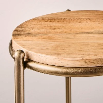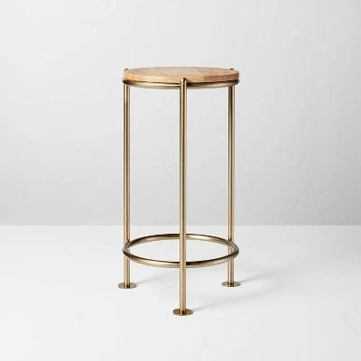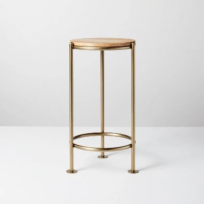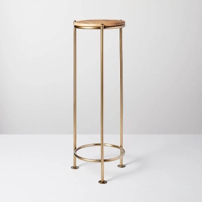 Bring sleek, modern style to your living space with this Wood & Brass Round Plant Stand from Hearth & Hand™ with Magnolia. Crafted from a metal frame with a brass finish and a natural wood tabletop, this plant stand makes for a stylish and functional piece to display your favorite potted plant in any room.